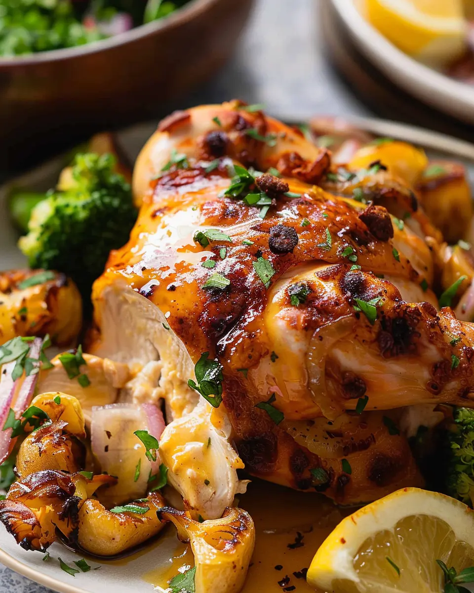 - Plating: Use large, colorful plates and slice the chicken to showcase the juicy fillings.