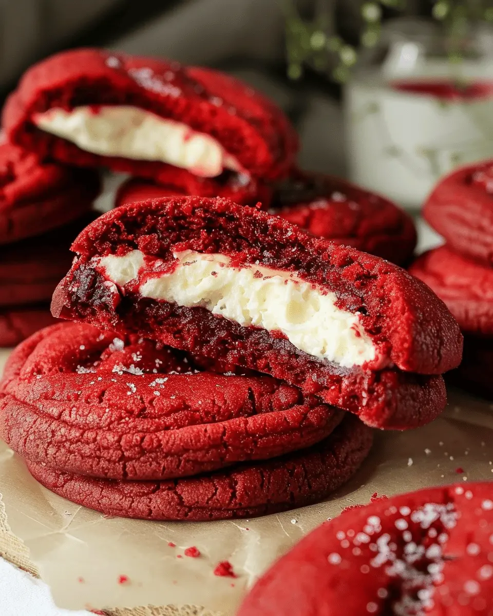 These cheesecake stuffed red velvet cookies are the perfect indulgent treat, combining the rich flavors of red velvet with a creamy cheesecake center.