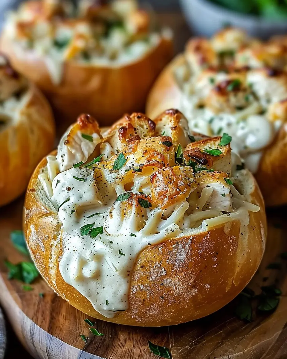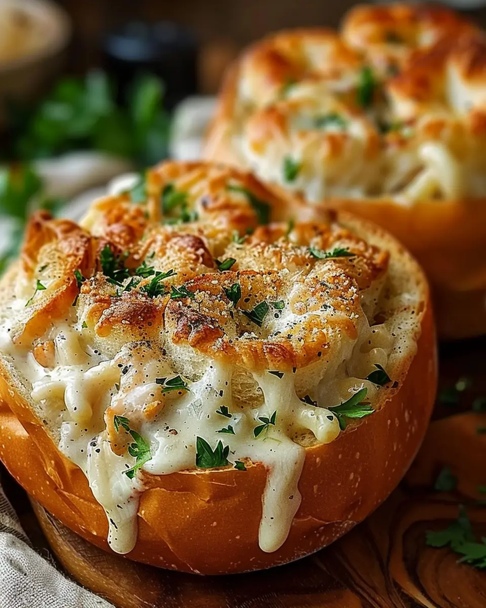 Delicious and comforting Chicken Alfredo served in crispy garlic bread bowls.