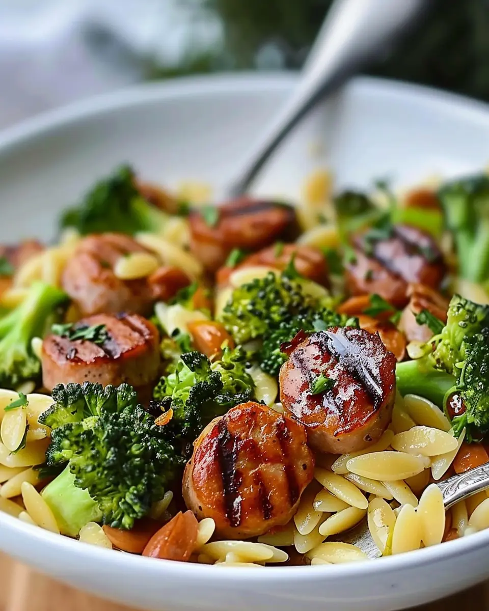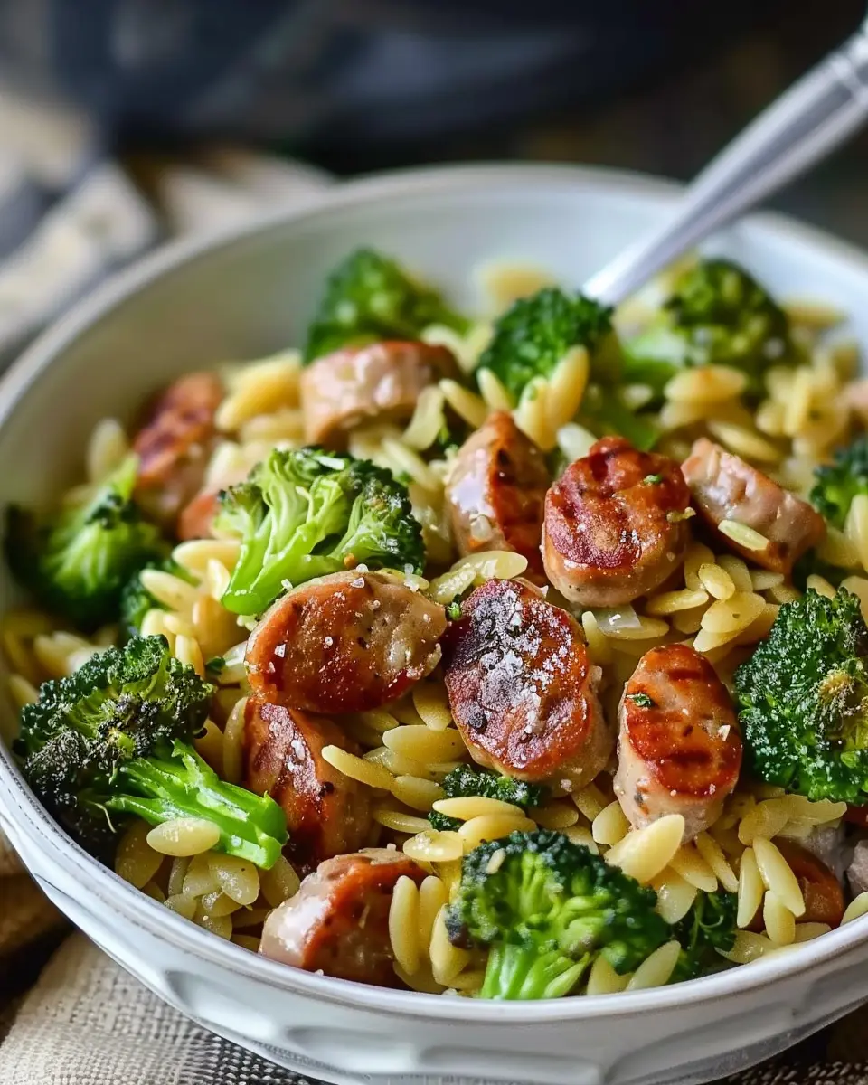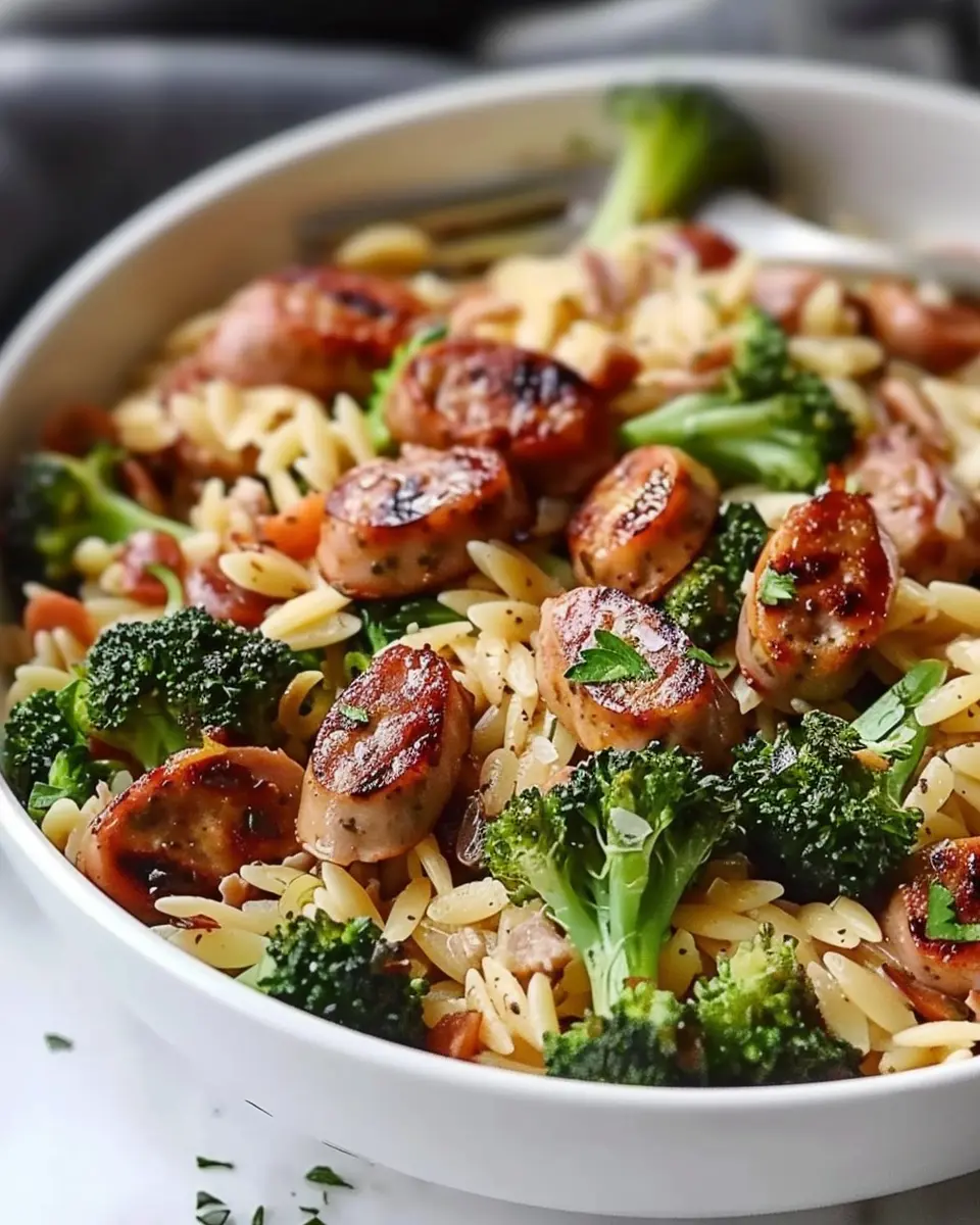 A quick and delightful meal featuring chicken sausage and broccoli with orzo pasta.