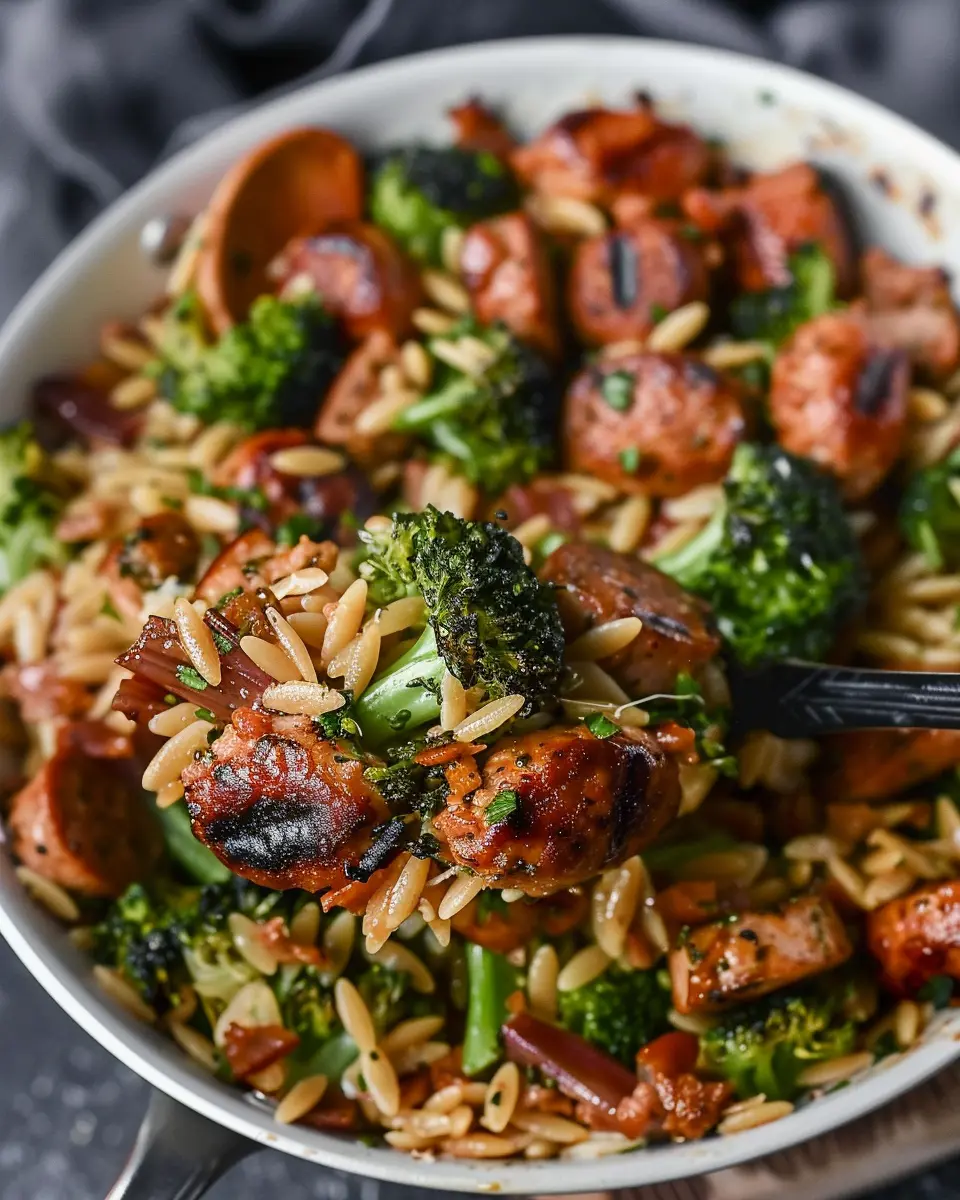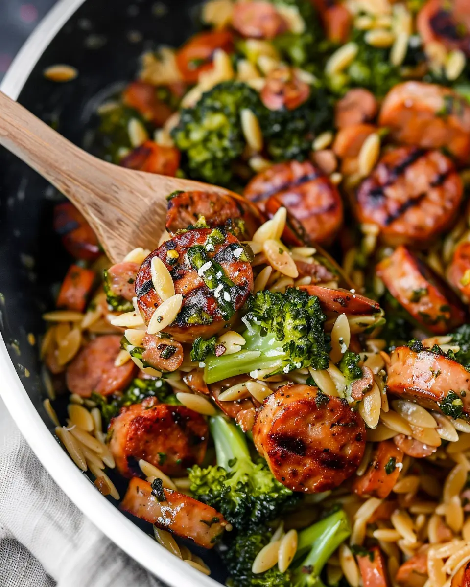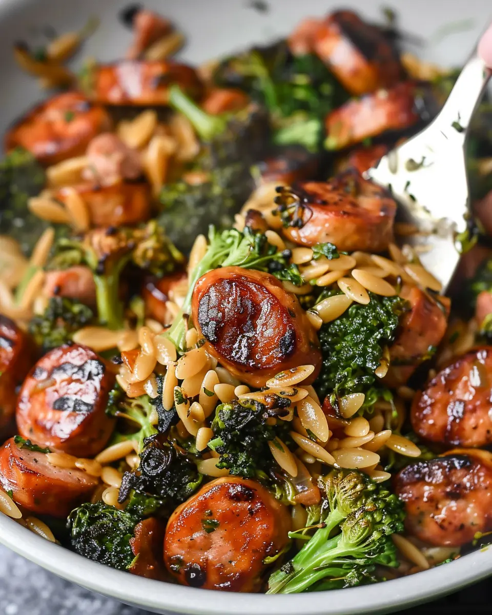 A quick and delicious meal that combines chicken sausage, broccoli, and orzo.