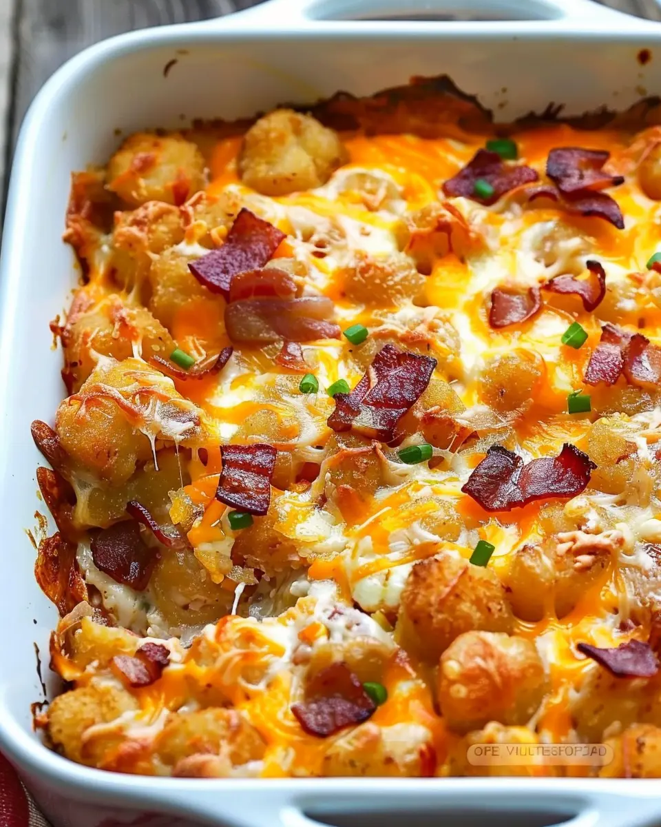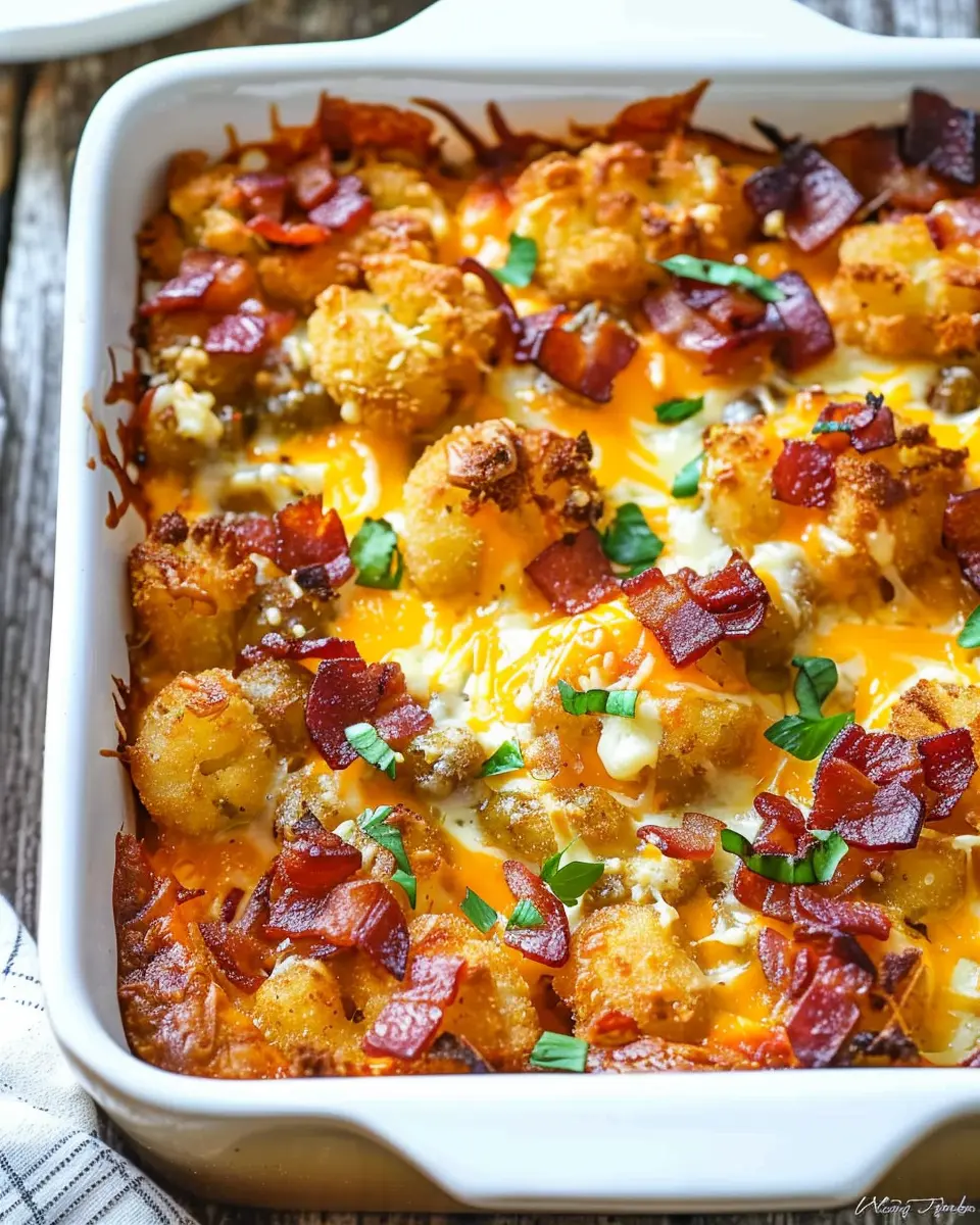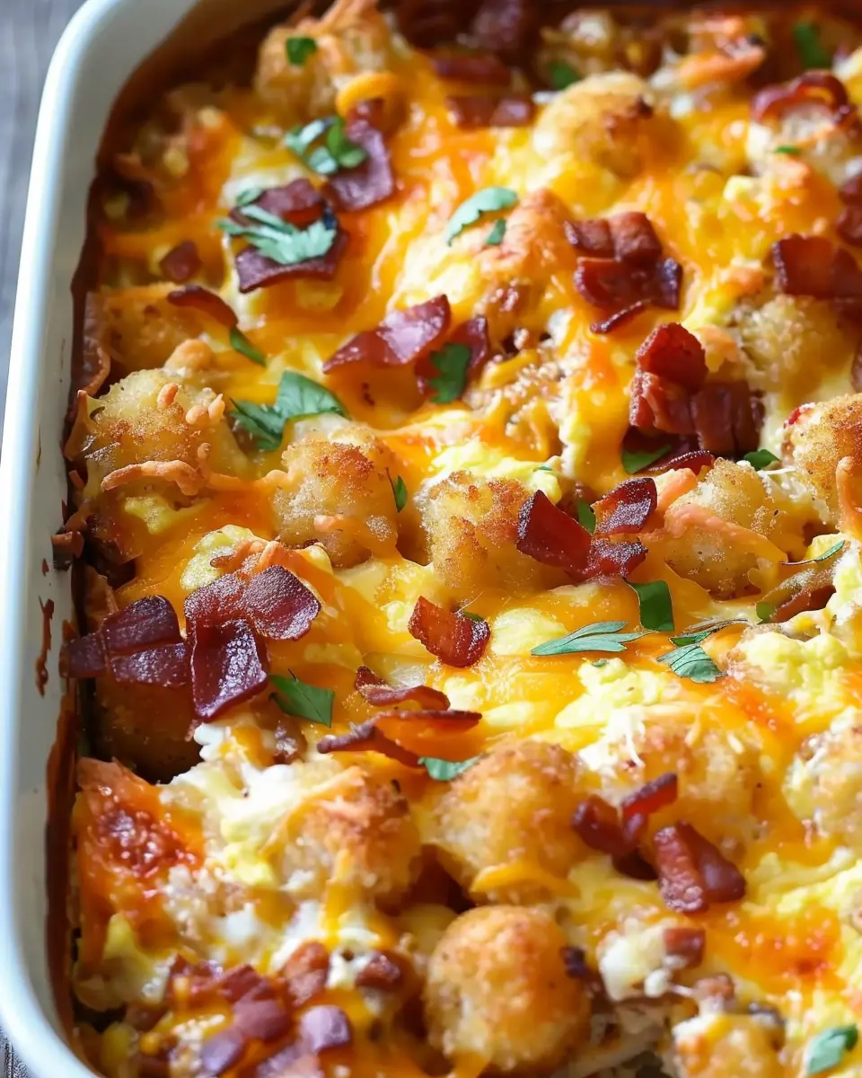A delicious breakfast casserole featuring crispy tater tots and turkey bacon, perfect for a hearty start to your day.
