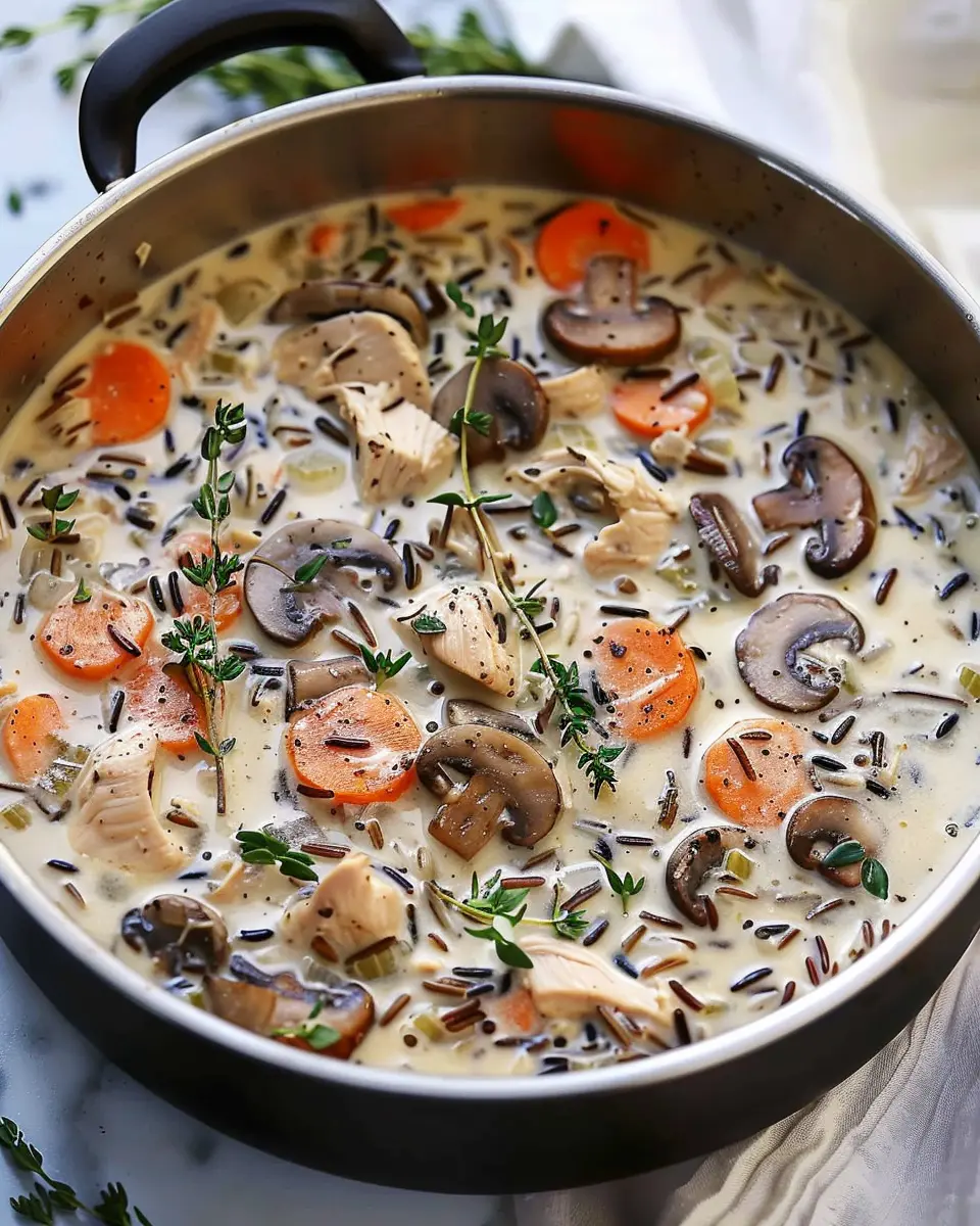 A rich and creamy chicken and wild rice soup with mushrooms that provides warmth and comfort in every bowl.