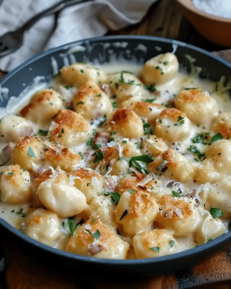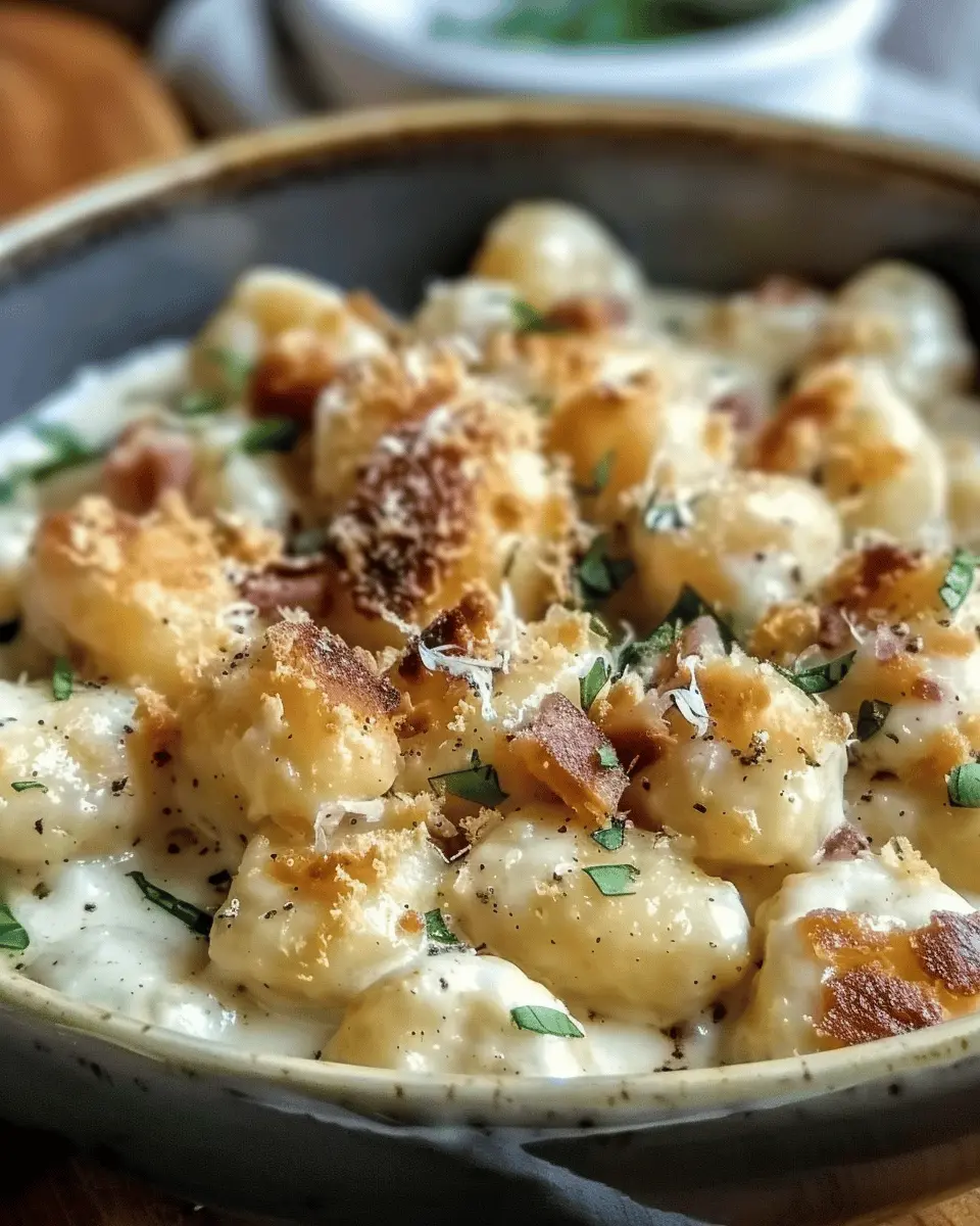 A comforting dish that combines creamy gnocchi with savory chicken and turkey bacon for a delightful meal.
