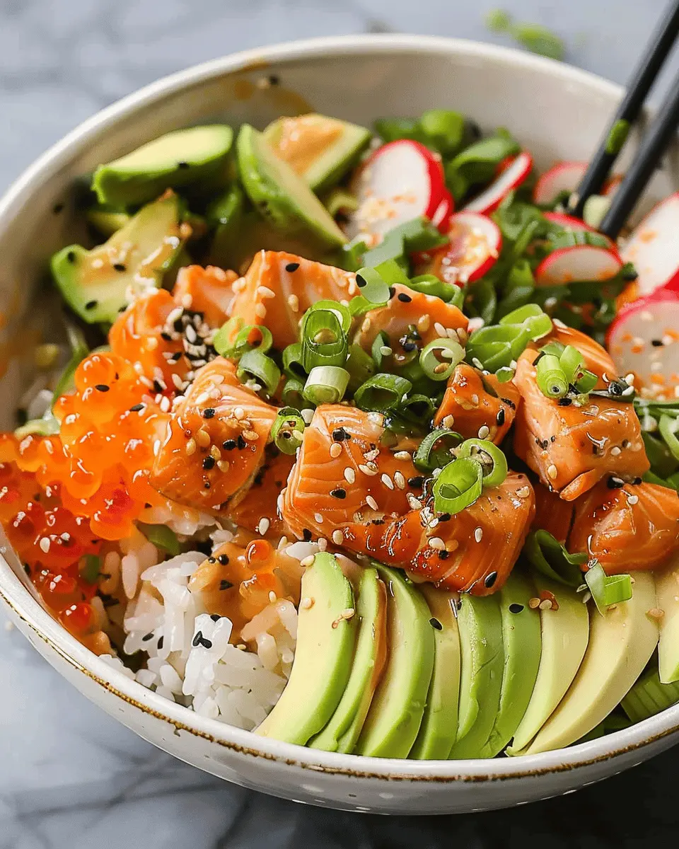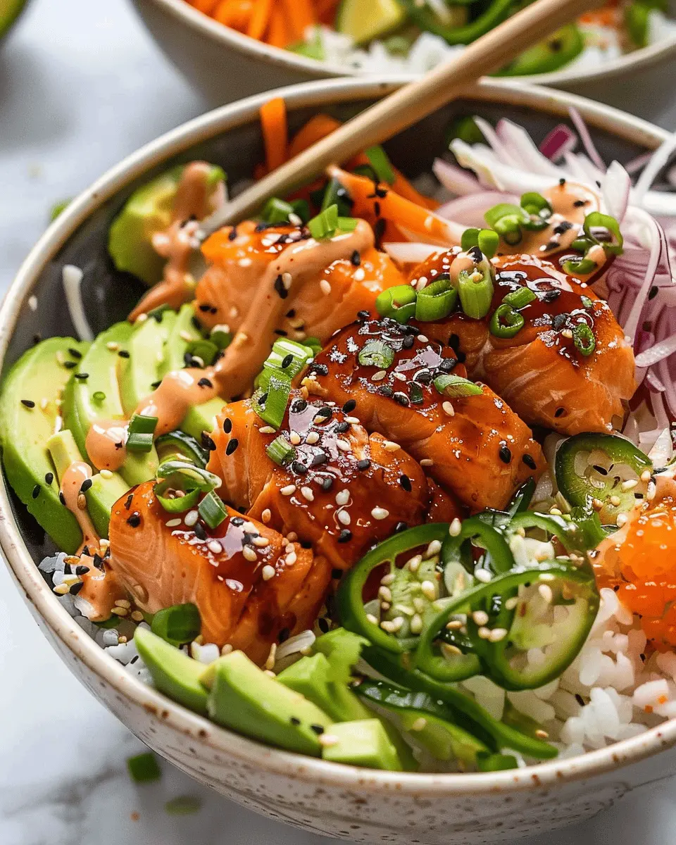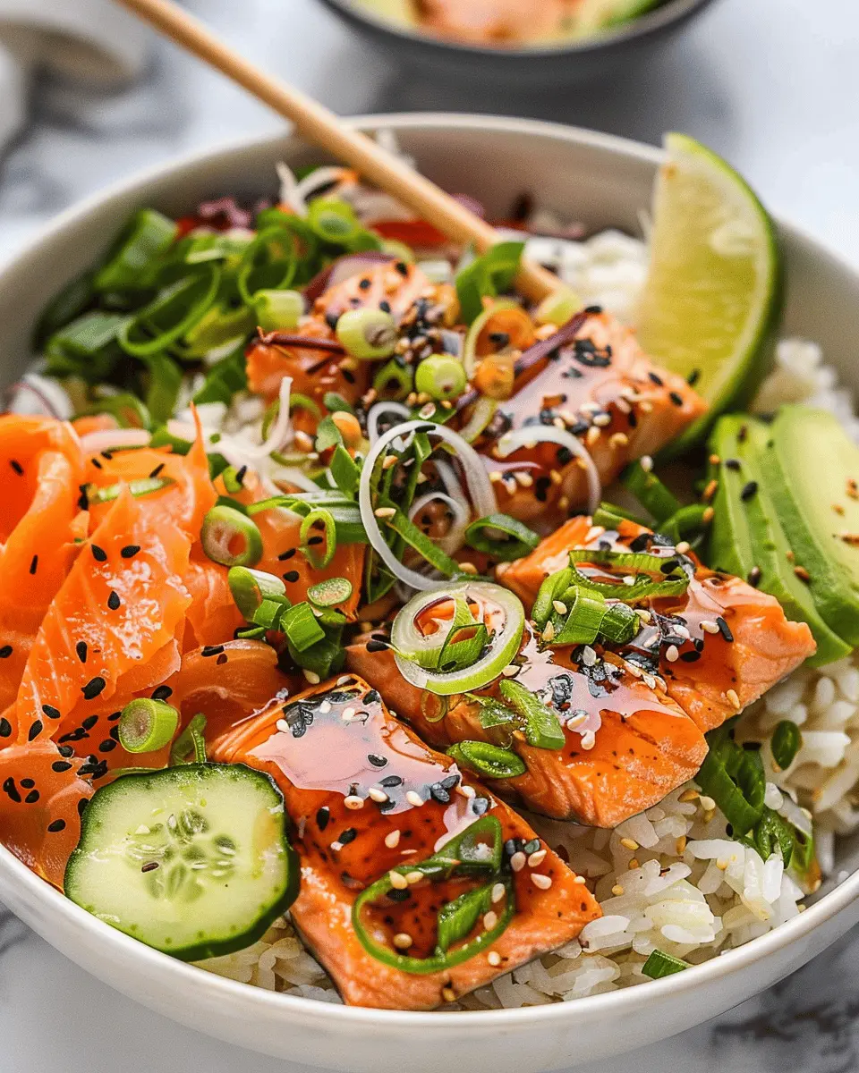 This bowl isn’t just a treat for your taste buds; it’s also a nutritious powerhouse. Each serving boasts around 30 grams of protein, courtesy of the salmon, making it a fantastic choice for fitness enthusiasts and busy professionals alike. The carbohydrate content is lower, around 15 grams, mainly from fresh veggies and grains, providing sustained energy without the crash.