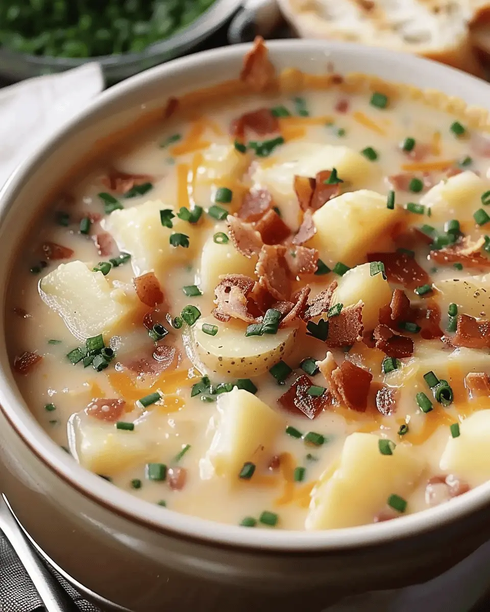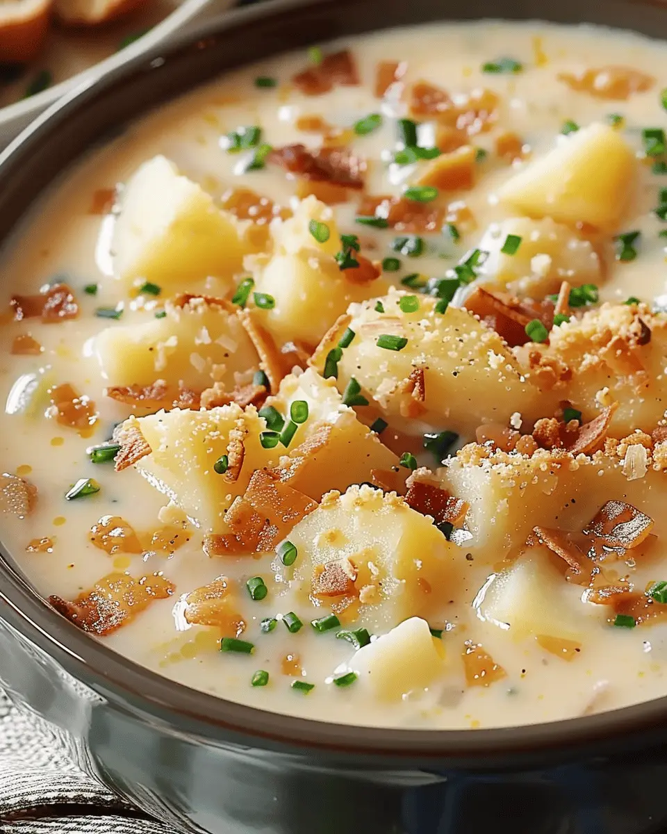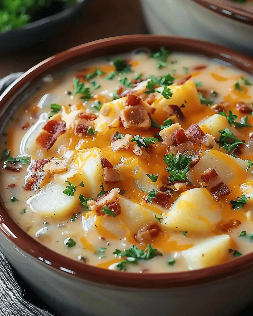 A creamy and indulgent potato soup featuring turkey bacon, perfect for cozy nights.