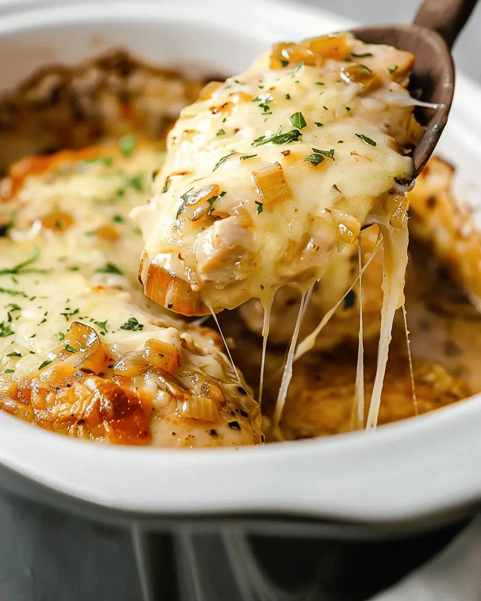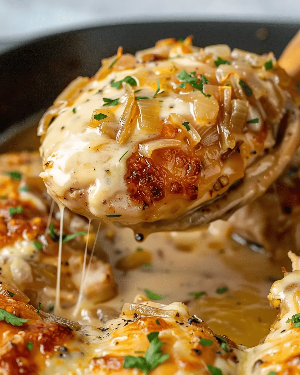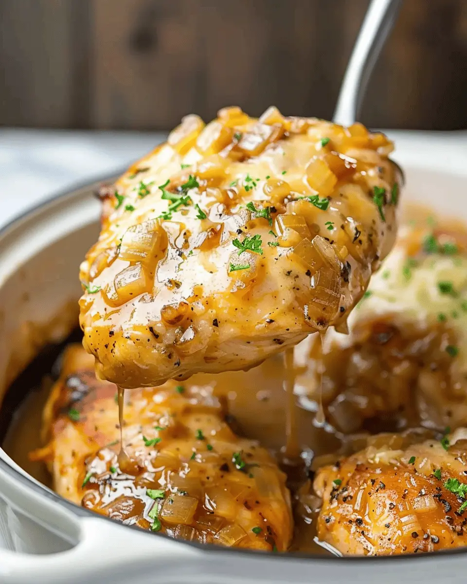 A comforting and flavorful dish that combines chicken and French onion soup flavors, perfect for a cozy dinner.