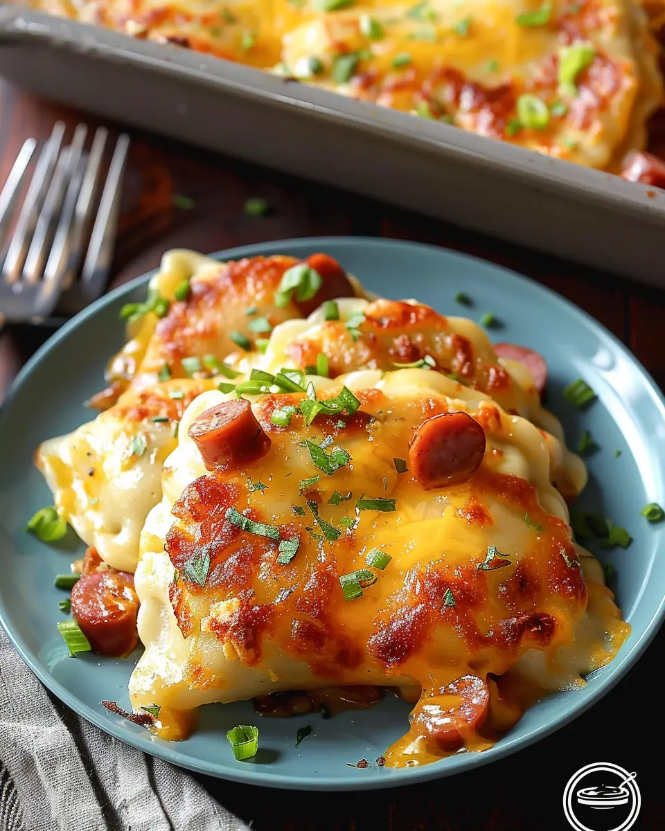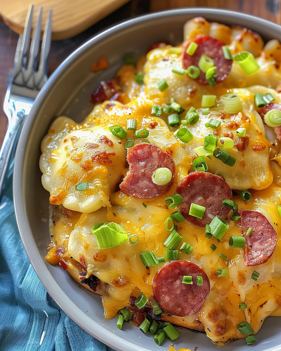 A warm and hearty casserole made with pierogi and kielbasa, perfect for a comforting meal.