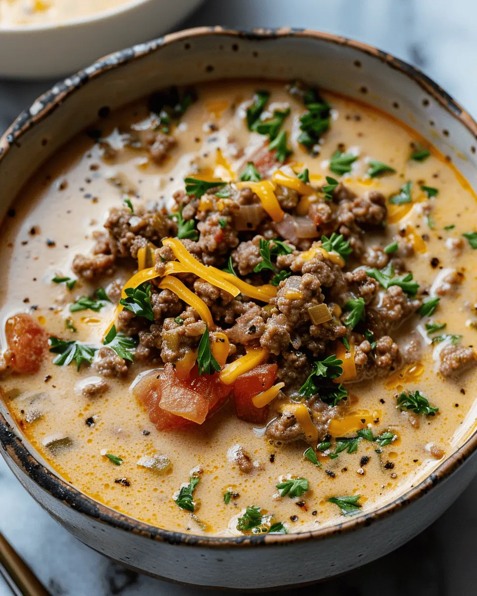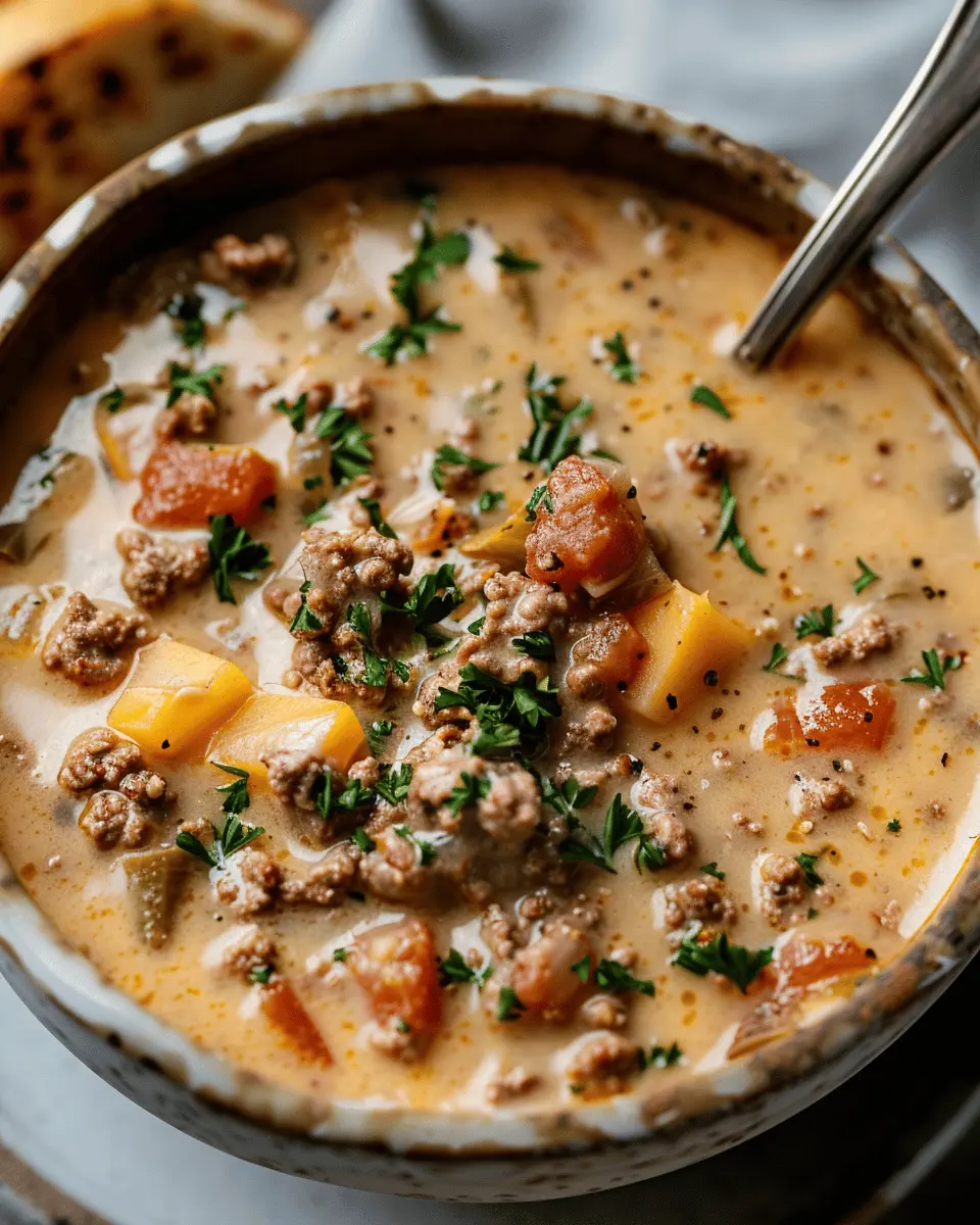 And there you have it — the perfect, comforting bowl of Crockpot Cheeseburger Soup ready to be devoured. Enjoy your creation with some crusty bread and dive into a satisfying meal that’s not just easy but also utterly delicious!