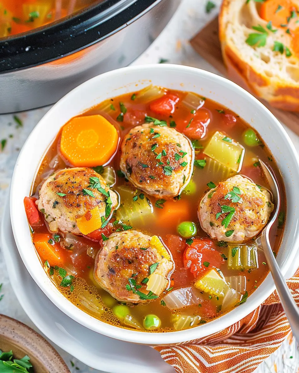 A warm and hearty crockpot vegetable soup filled with chicken meatballs, perfect for cold days.