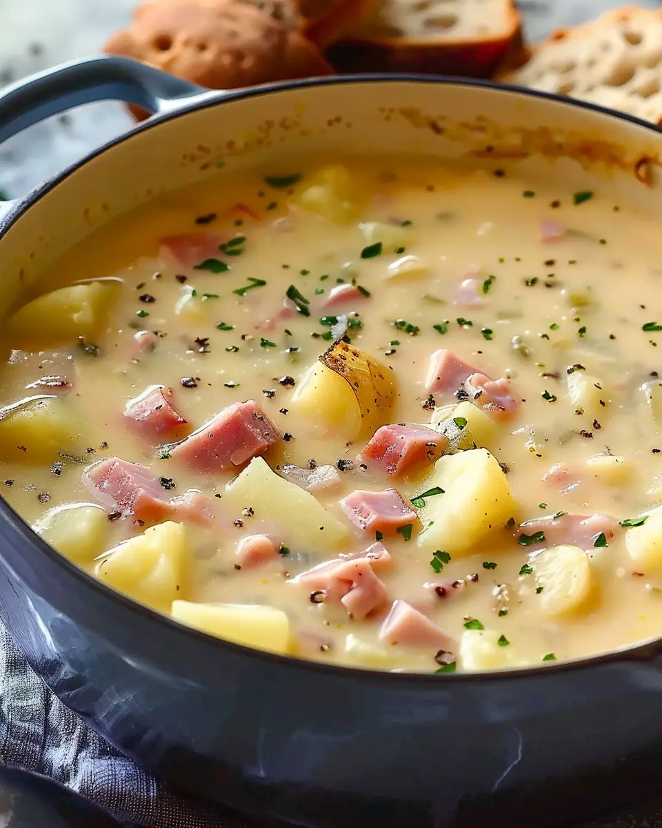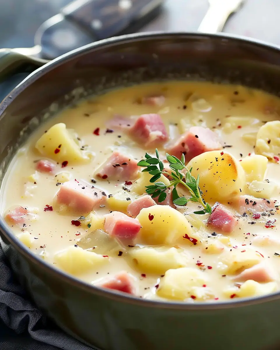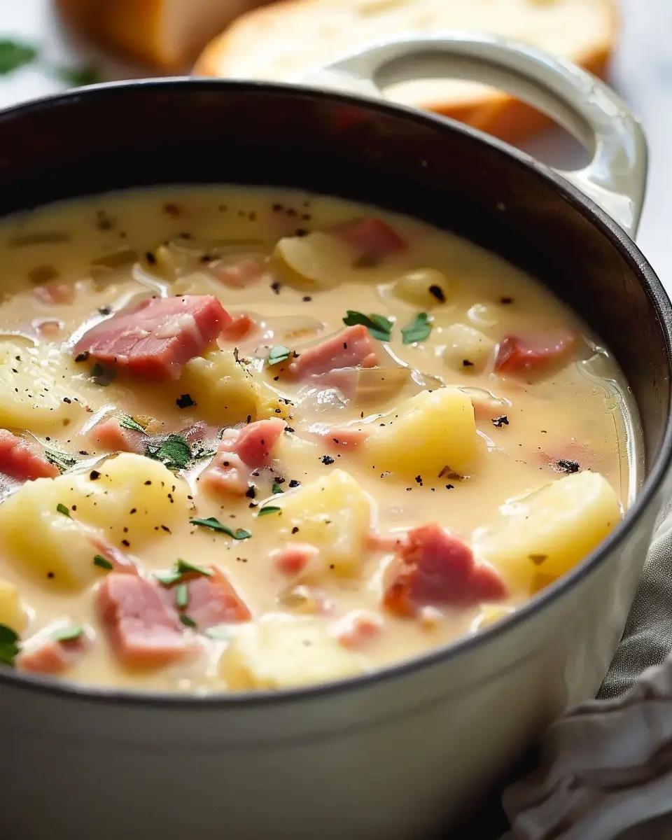 A delicious and hearty soup made with ham, potatoes, and turkey bacon, perfect for a cozy meal.