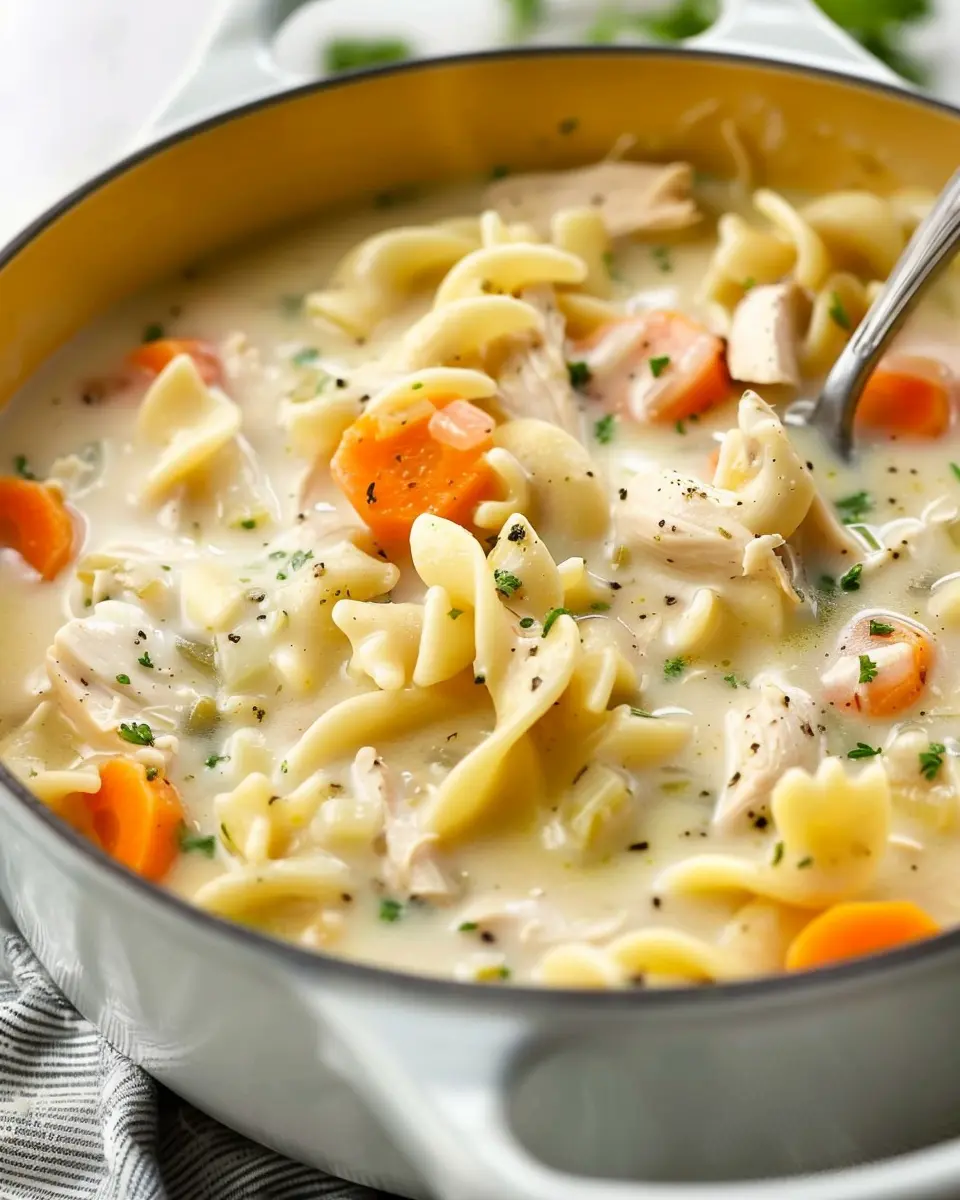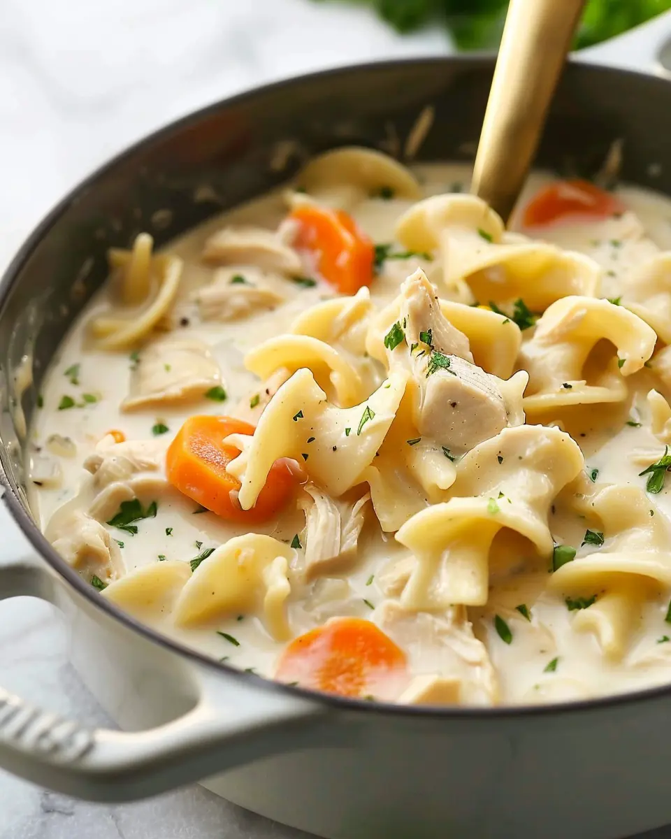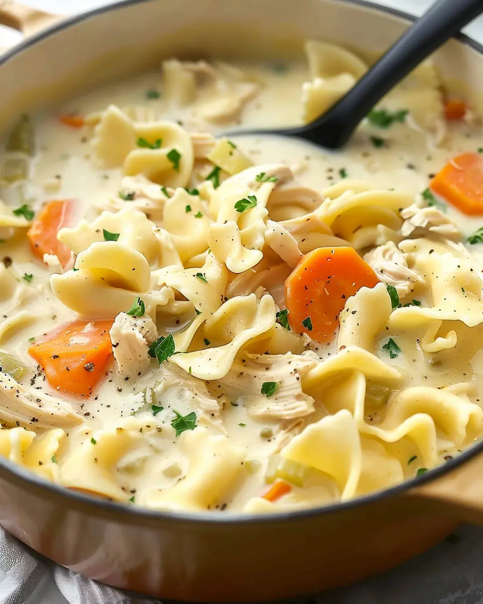 Enjoy a bowl of this Easy Creamy Chicken Noodle Soup, enriched with the savory taste of turkey bacon.