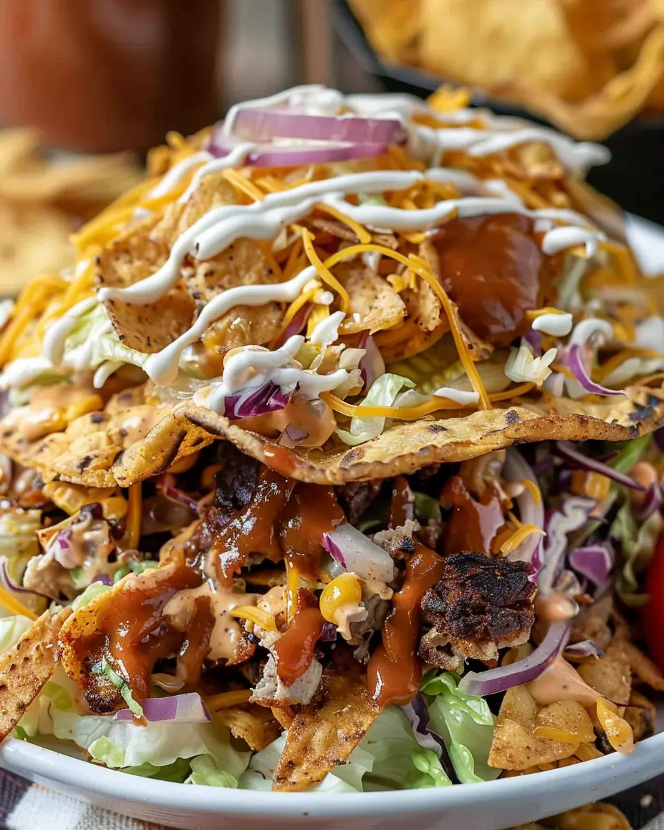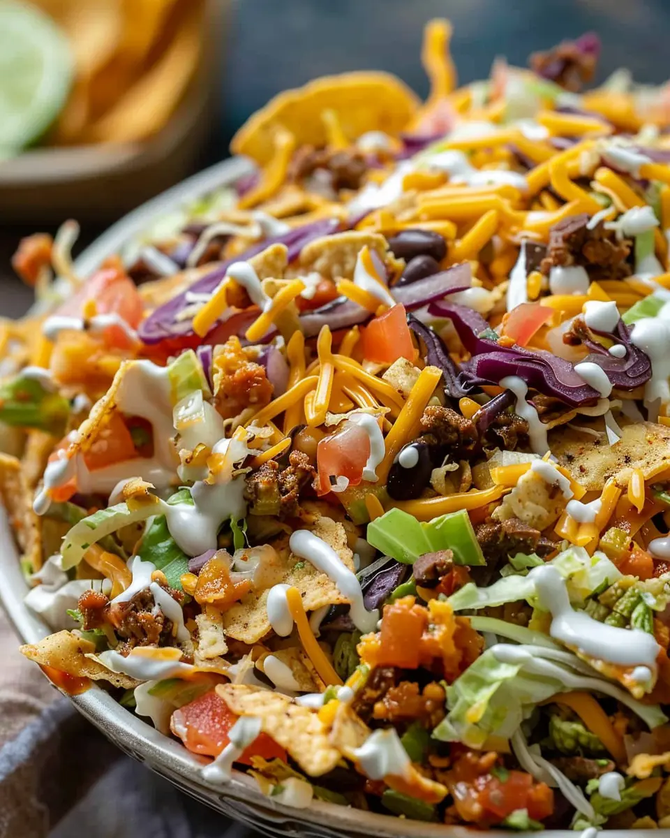 Finally, the pièce de résistance—the Fritos! Just before serving, sprinkle the Fritos over the top of the salad mixture. This ensures they stay crunchy and don’t get soggy, which is key for texture.
