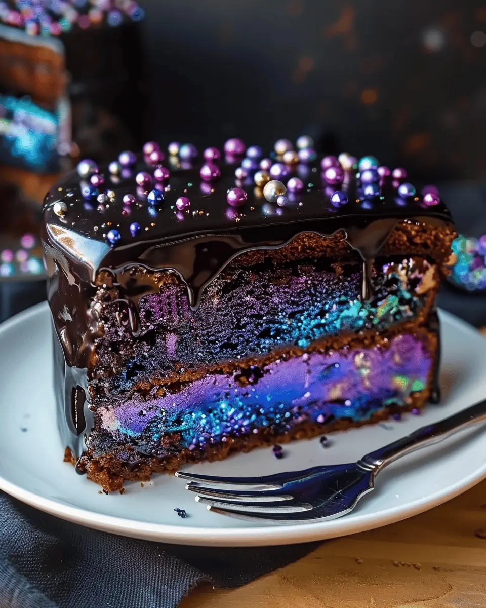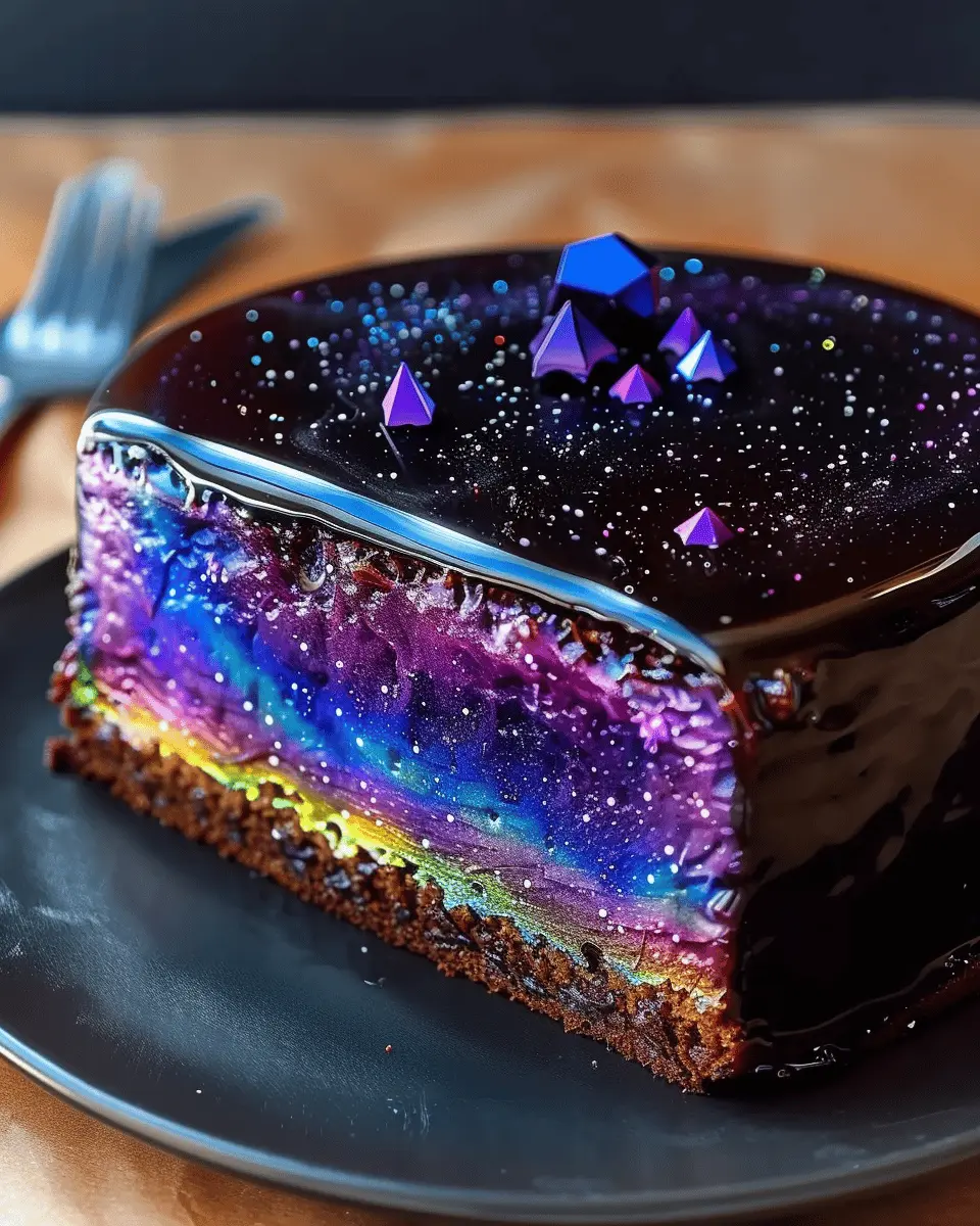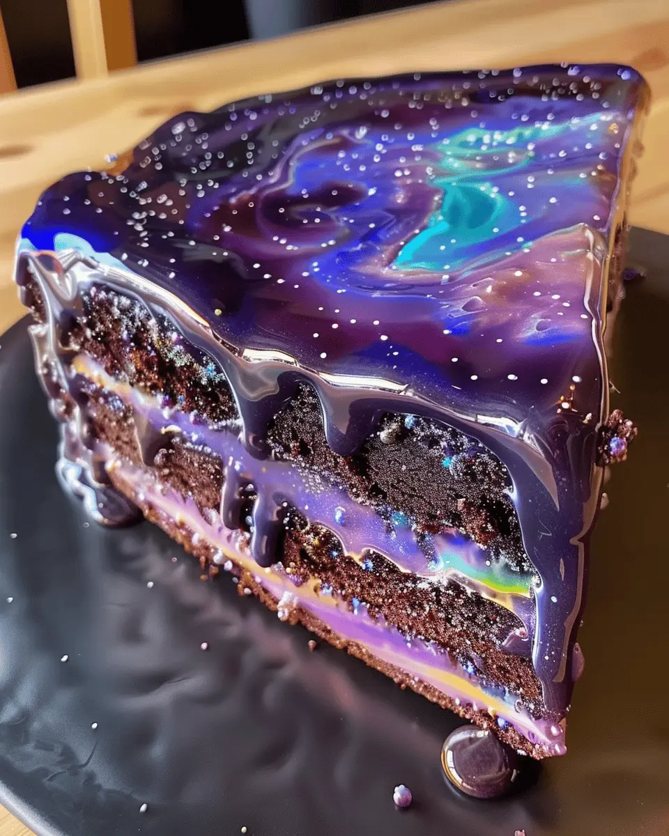 Make sure your galaxy mirror glaze kuchen shines on the table. Use a beautiful cake stand, and perhaps sprinkle some edible glitter for that extra touch of magic. Don’t forget to cut the slices with a sharp knife; this helps maintain the mesmerizing glaze!