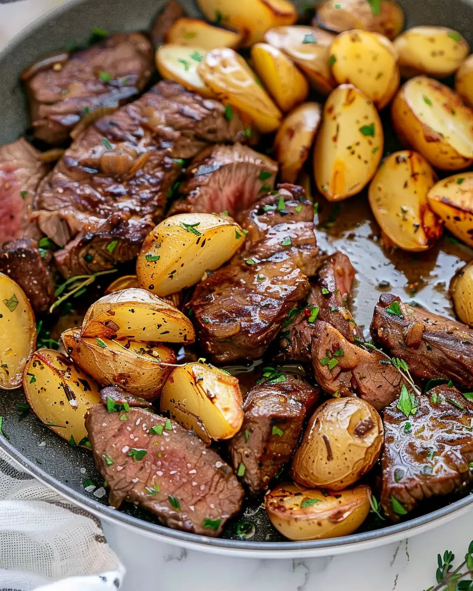 A delightful and hearty dish combining steak and potatoes in a rich garlic butter sauce, perfect for a comforting meal.