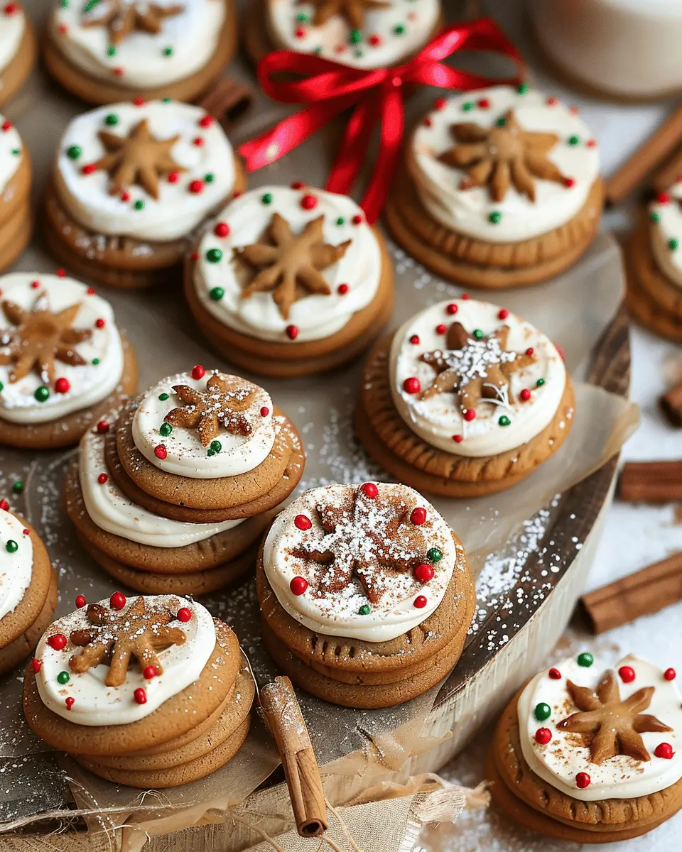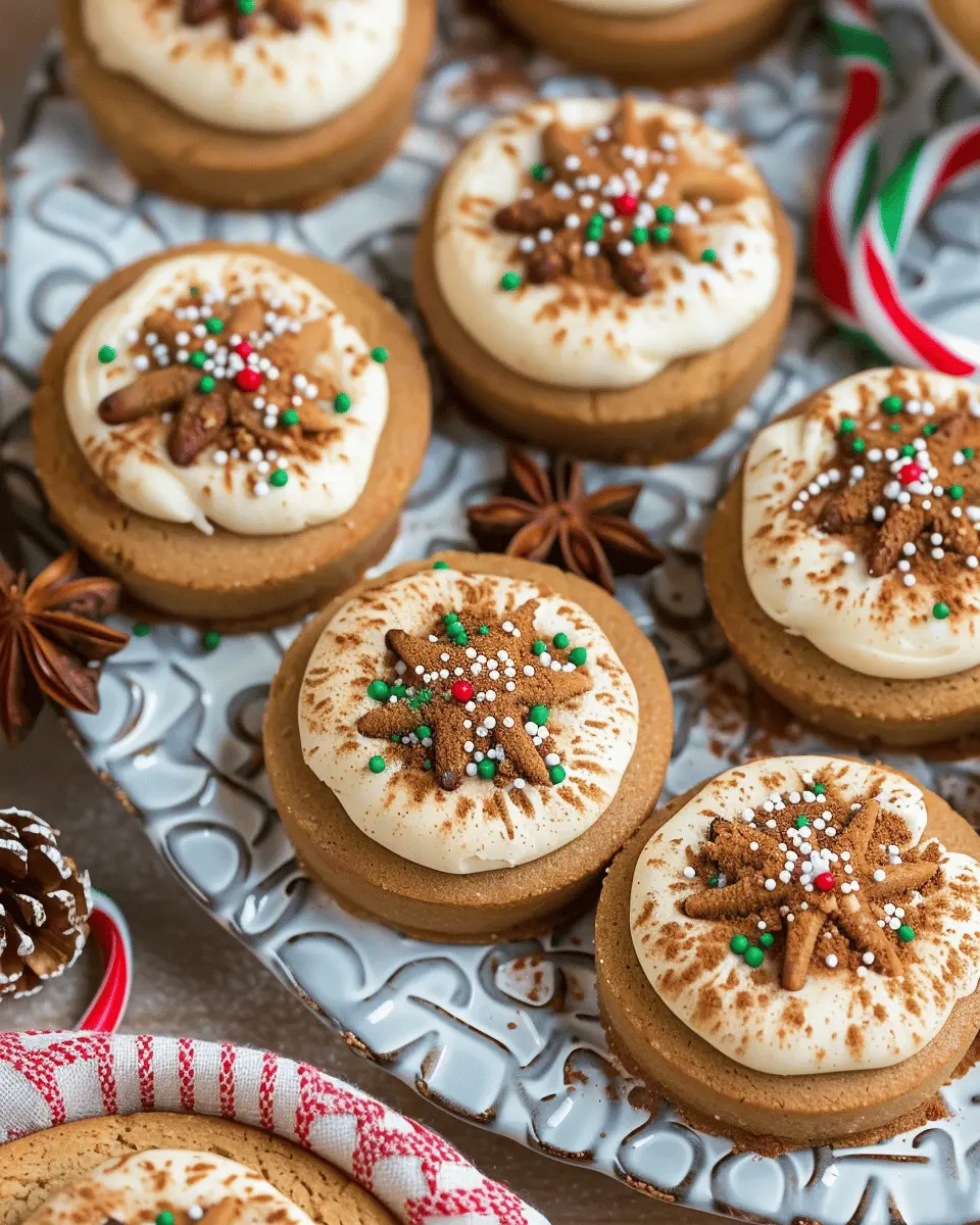 Once the cookies are cool, fill each cookie cup with a generous dollop of your cheesecake frosting. For an extra festive touch, consider garnishing with a sprinkle of ground cinnamon or festive sprinkles. As you assemble your gingerbread cheesecake cookies, let your creativity shine. You can also top them with mini chocolate chips, caramel drizzle, or even crushed ginger snaps for texture!
