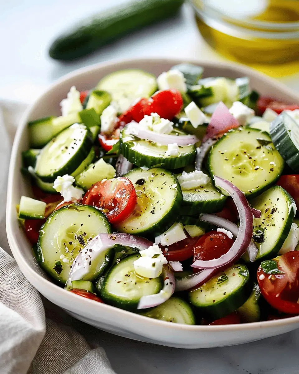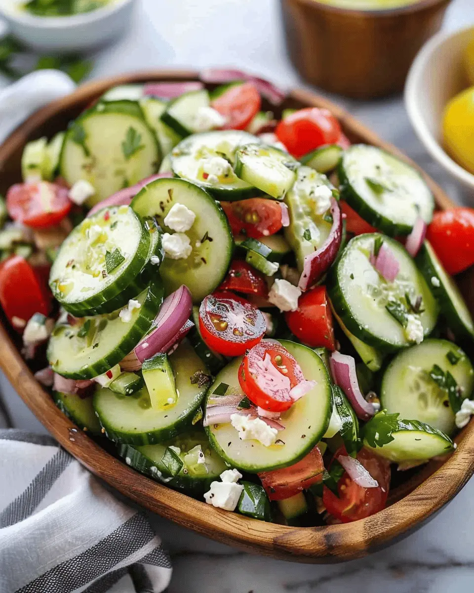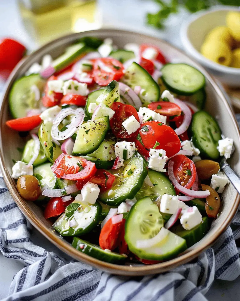 Imagine coming home after a long day and needing to whip up something healthy in a pinch. The Greek Cucumber Salad offers just that. With minimal effort, you can create a dish that bursts with flavor and offers essential nutrients. It’s perfect for your lunchbox or as a side for dinner. Plus, with summer right around the corner, the crispness of the cucumbers and the zesty dressing feels like a bite of sunshine.