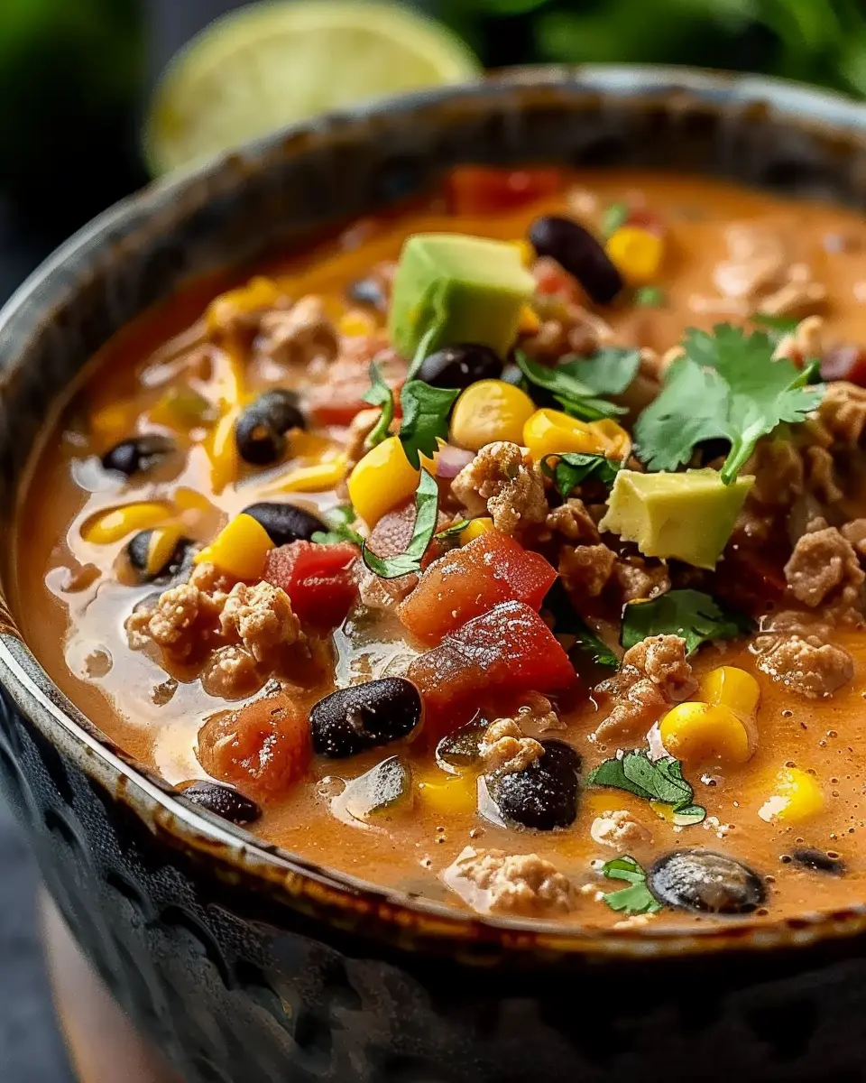 A hearty and nutritious taco soup enriched with high protein ingredients like turkey bacon and chicken ham.