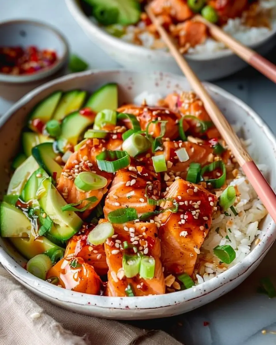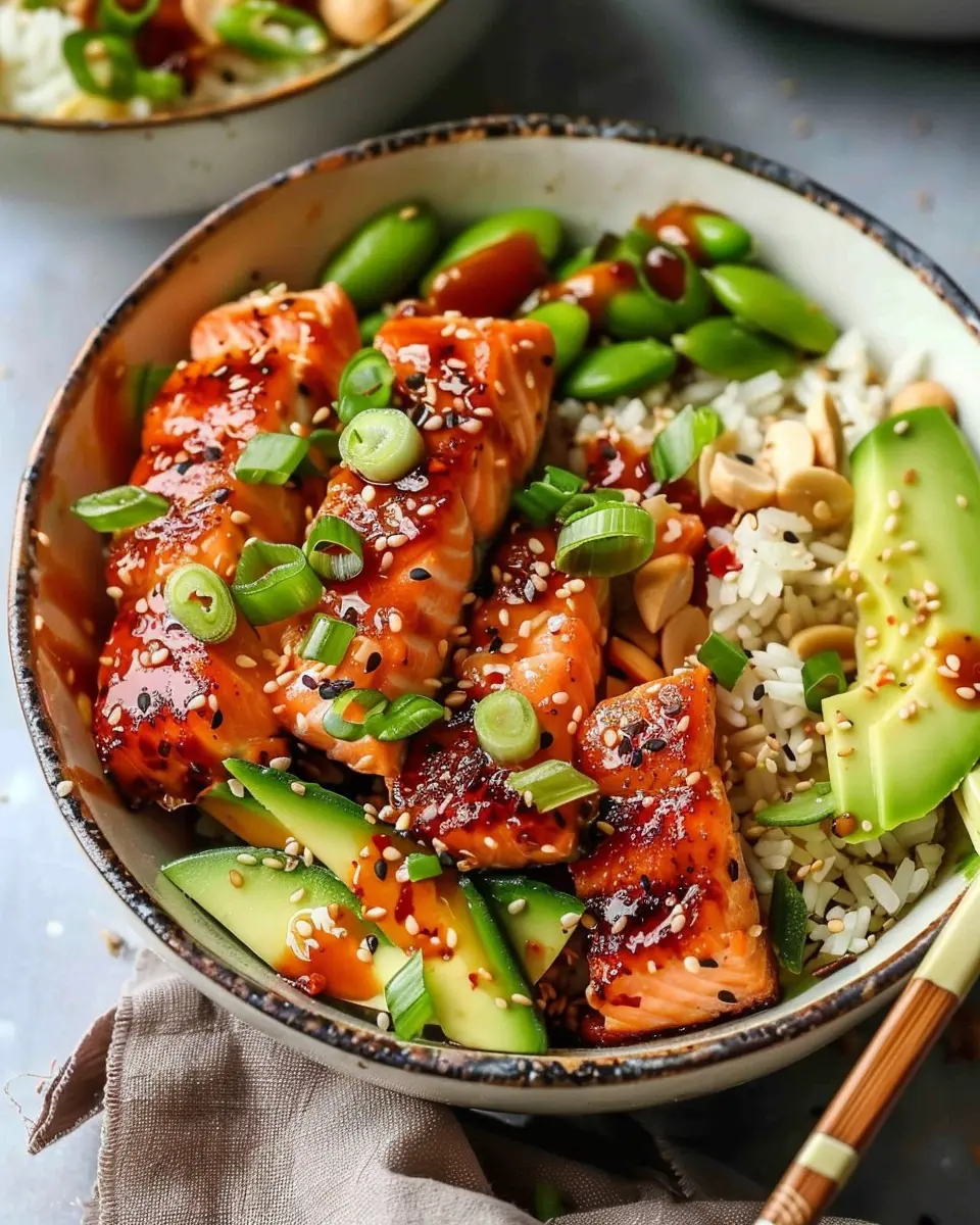 Keywords: Honey Sriracha Salmon Bowls, easy dinner, weeknight meal, salmon recipe