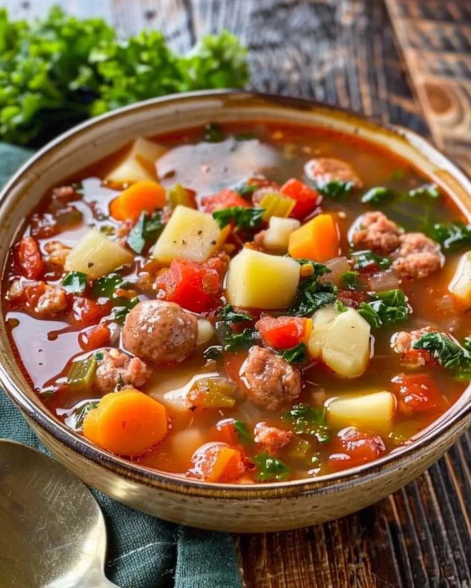 Experience the warmth and comfort of a delicious Italian Sausage Soup made with savory sausage, vegetables, and rich broth.
