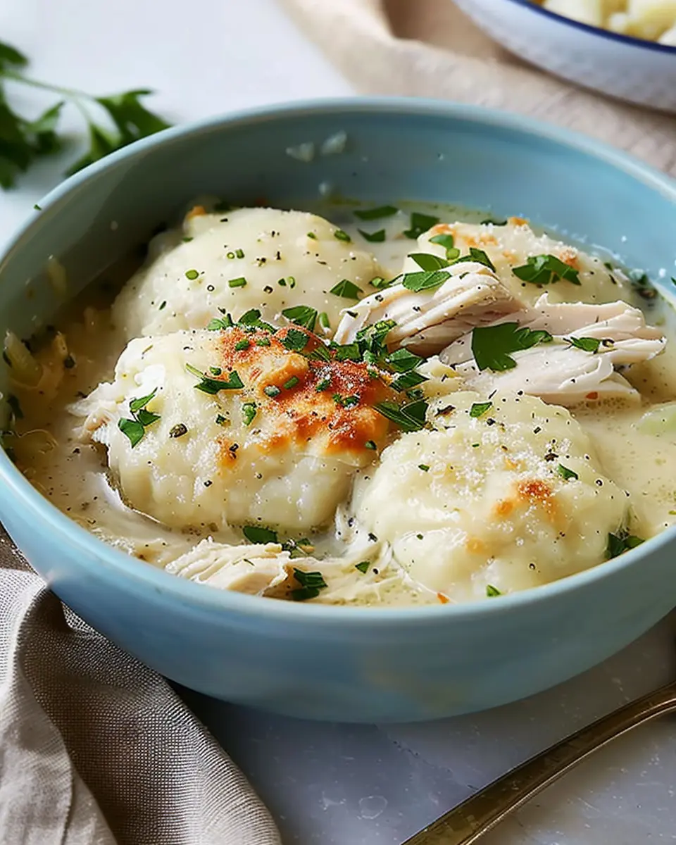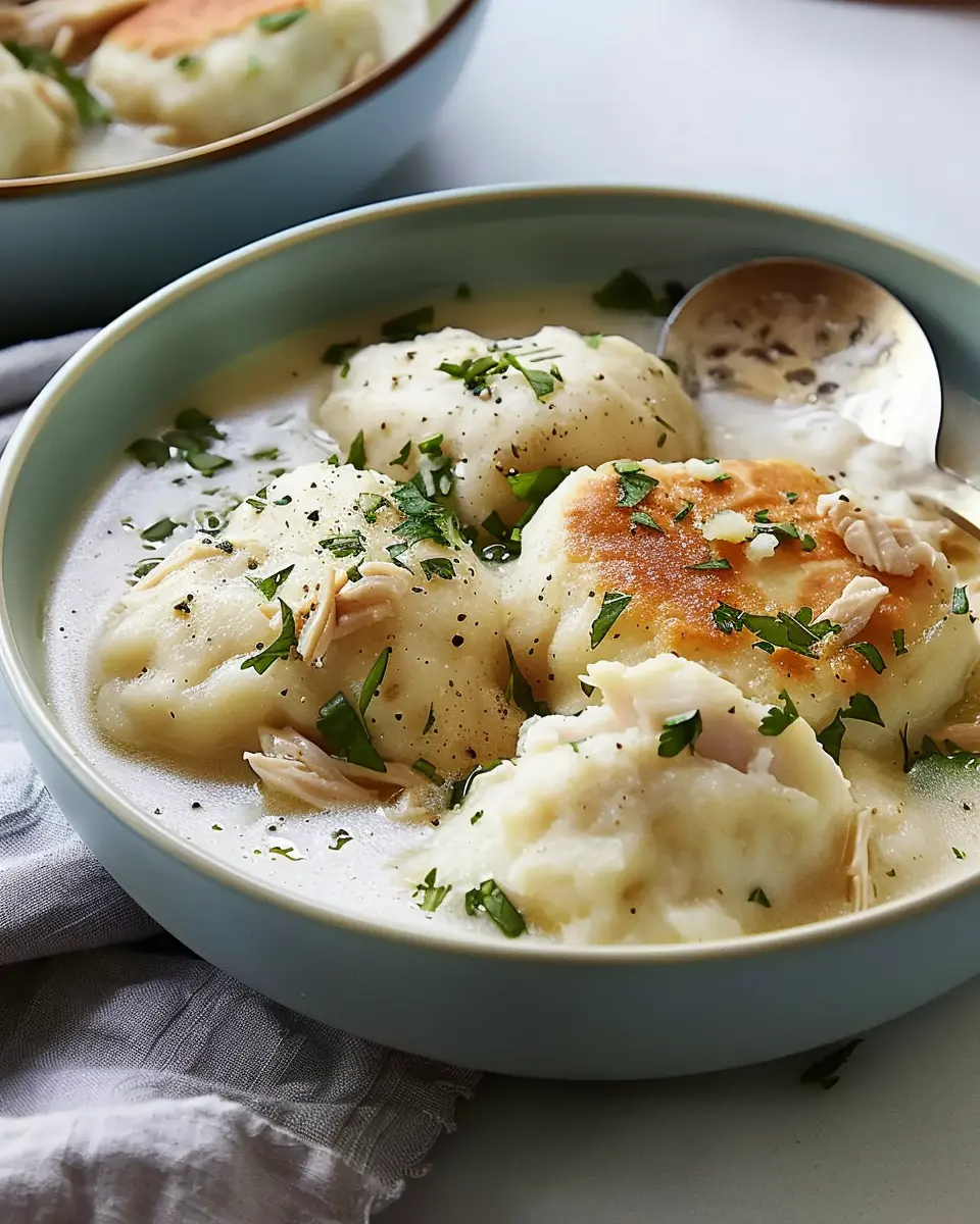 A warm and comforting dish that brings the flavors of home cooked meals to your table with tender chicken and fluffy dumplings.