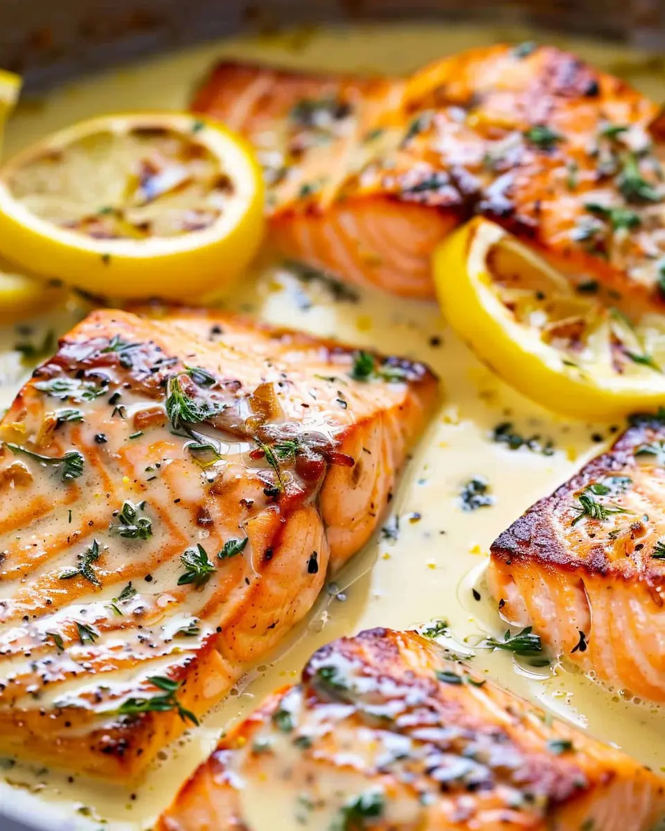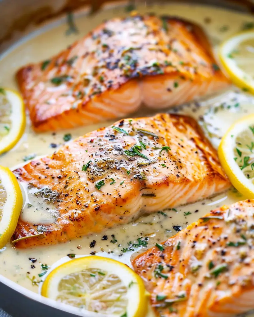 Keywords: Pan-Seared Salmon, Creamy Lemon Sauce, Easy Salmon Recipe