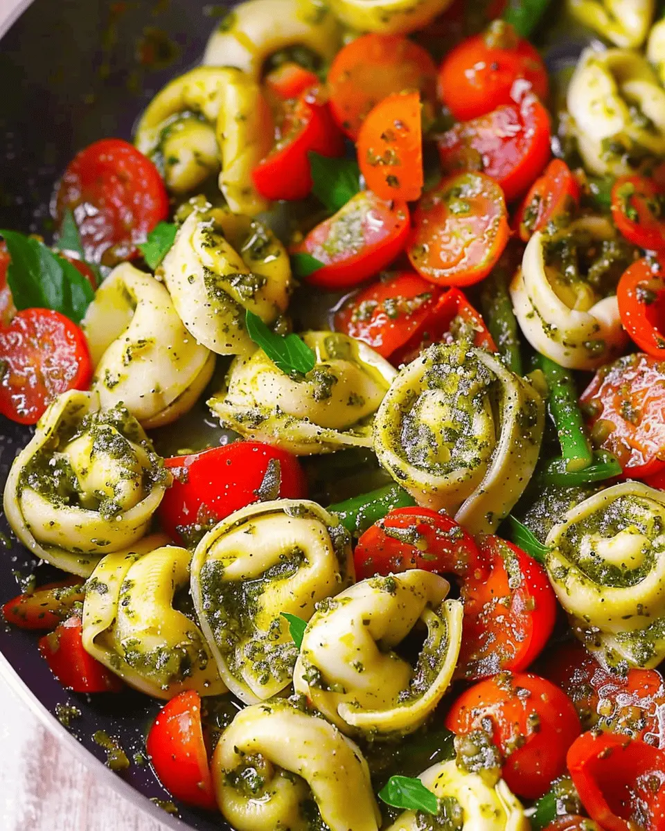 Now, let’s add some vibrant colors and textures to our Pesto Chicken Tortellini.