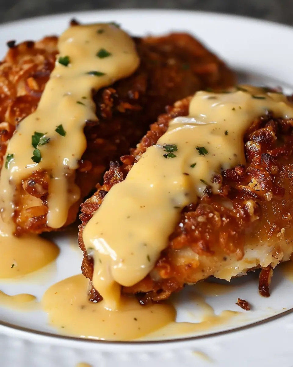 Pretzel Chicken Delight with Creamy Mustard Cheddar Sauce