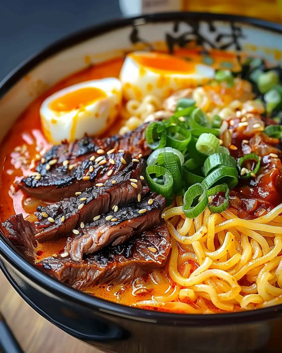Experience a taste adventure with Spicy Korean Ramen featuring grilled beef and a creamy sauce.