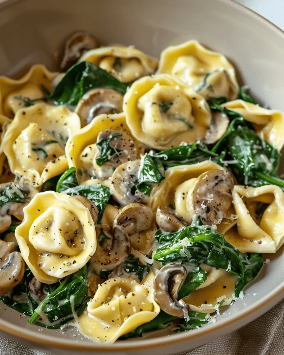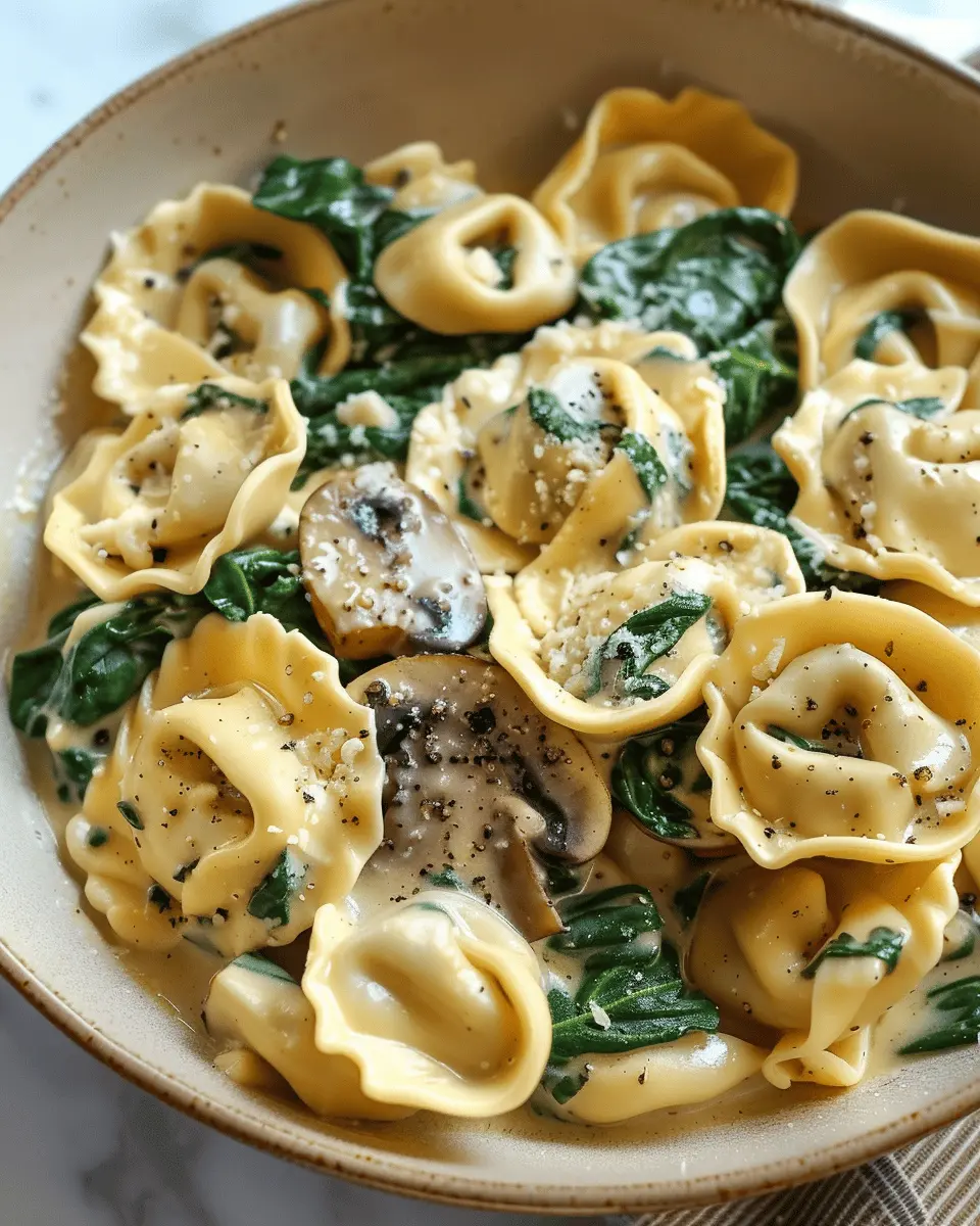 - Incorporate Tortellini: Gently fold the drained tortellini into the creamy spinach and mushroom mixture.