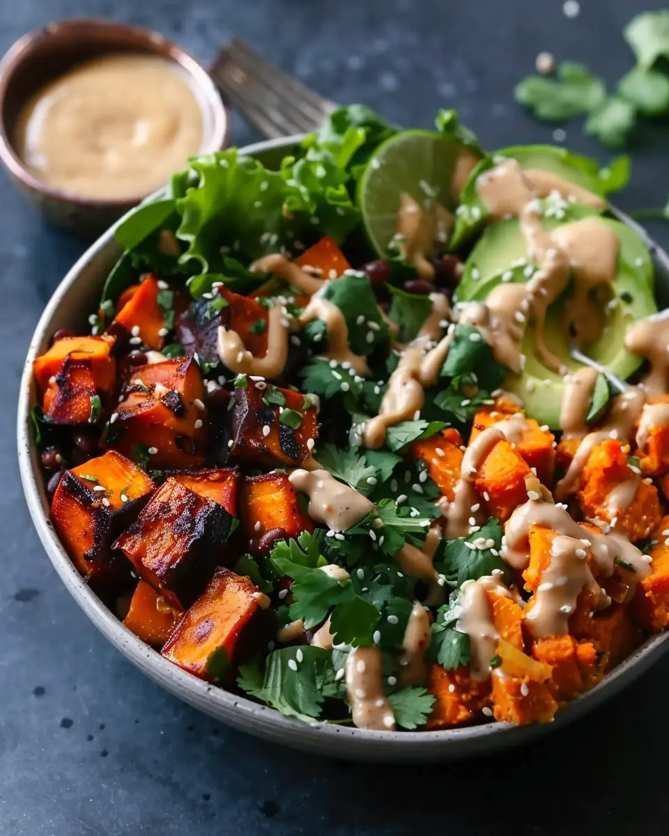 If you’re looking for a lighter, plant-based option, try a vegan sweet potato bowl. Roast your sweet potatoes and pair them with: