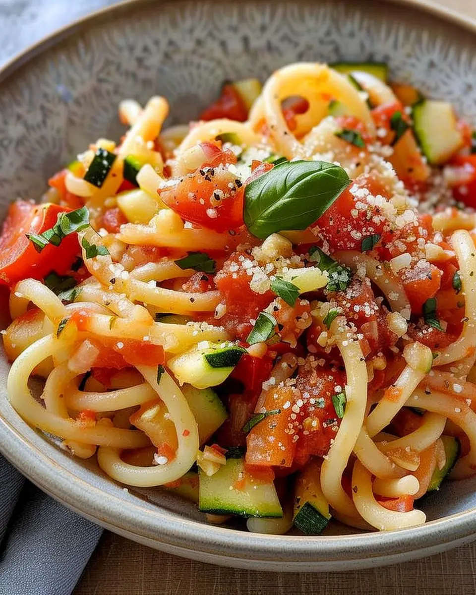 Enjoy every bite of your homemade tomato zucchini pasta!